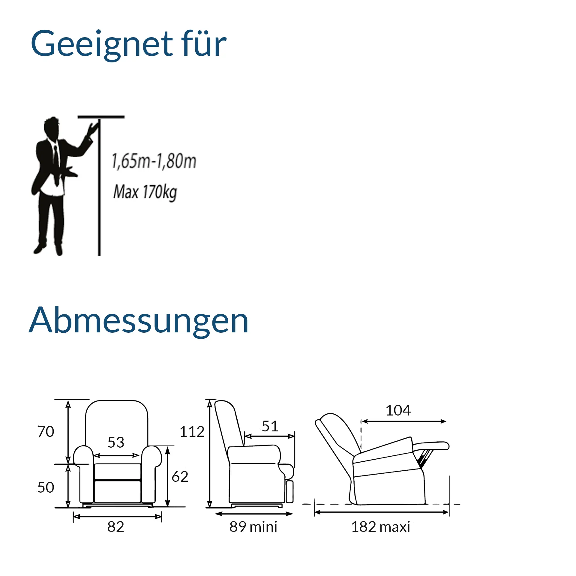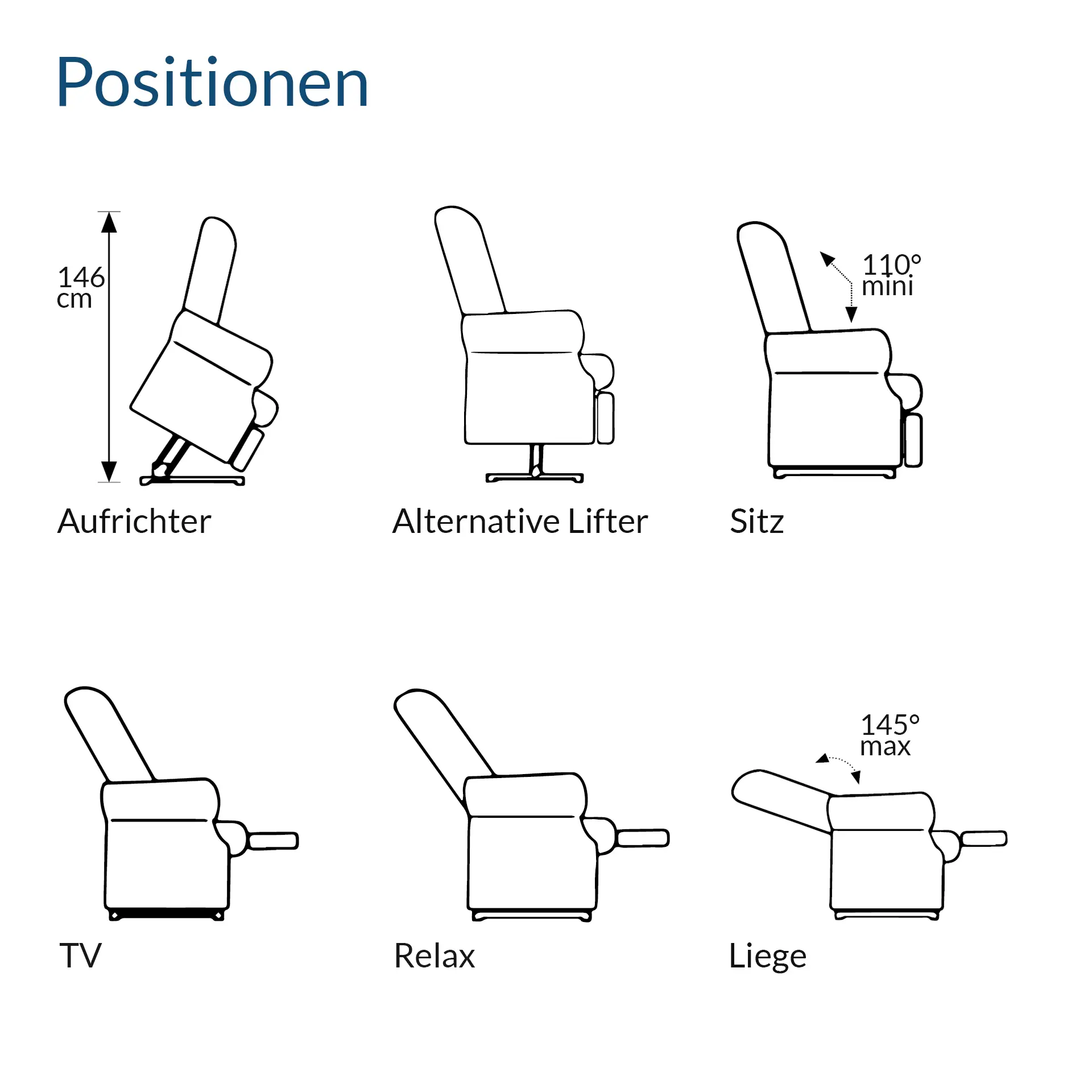 | Funktionen: | Aufstehfunktion, Alternative Liftfunktion, Massage & Wärme (extra Modell) |
